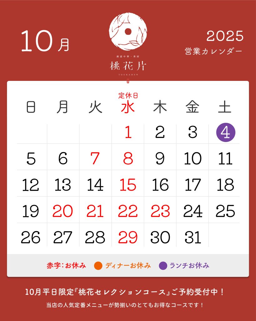 当店の人気定番メニューがお得になる10月平日限定「桃花セレクションコース」ご予約受付中です‼️